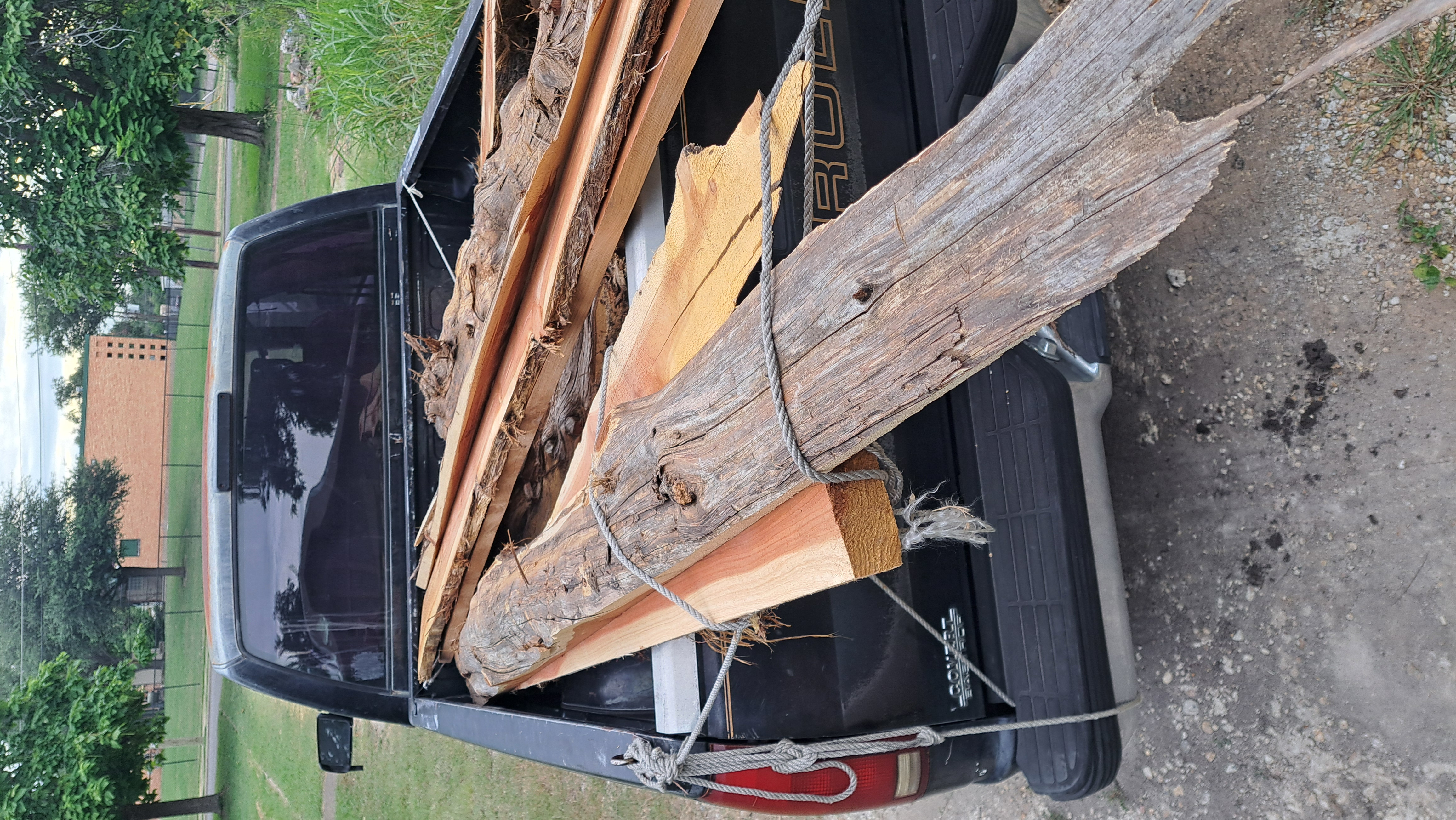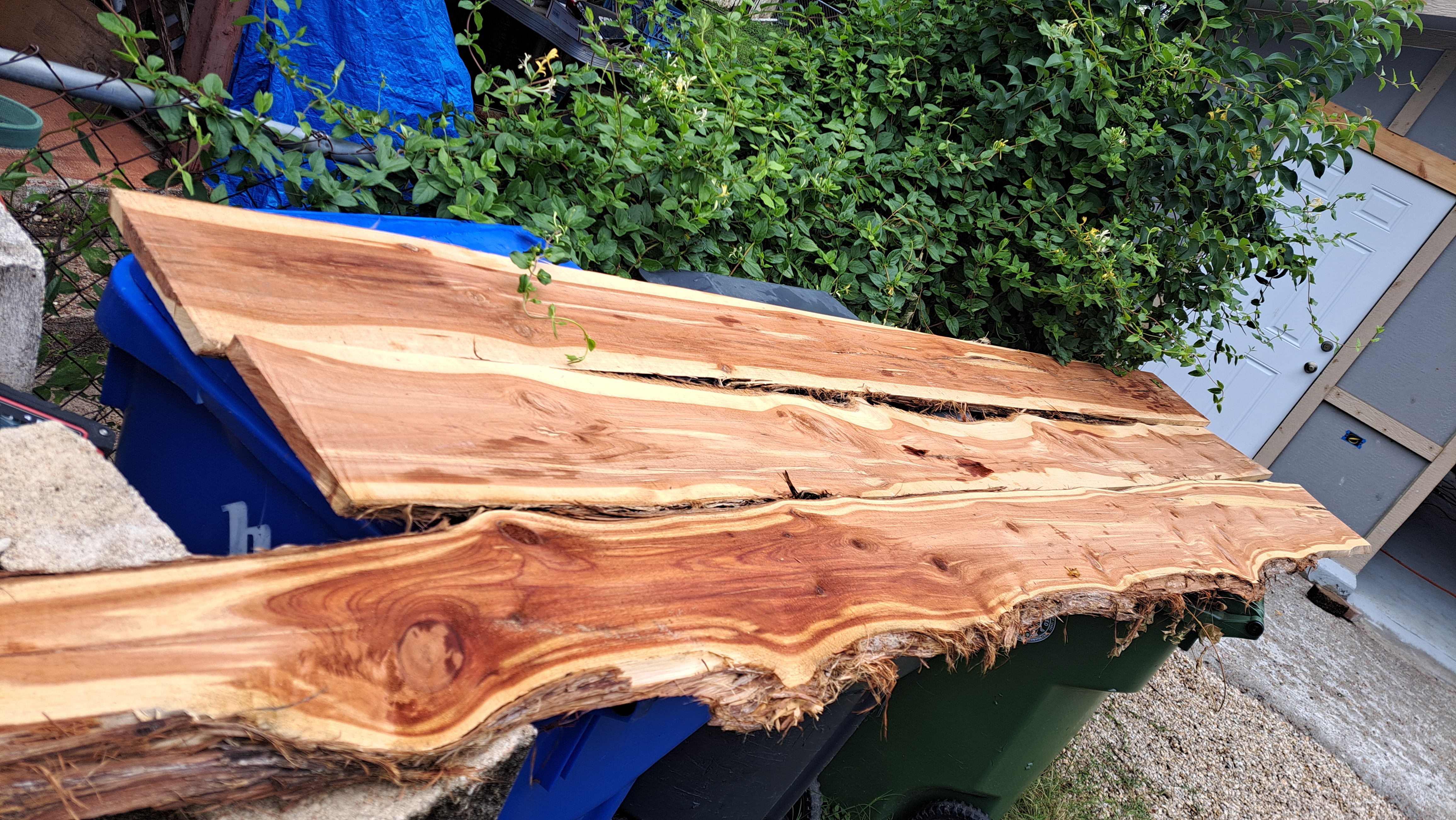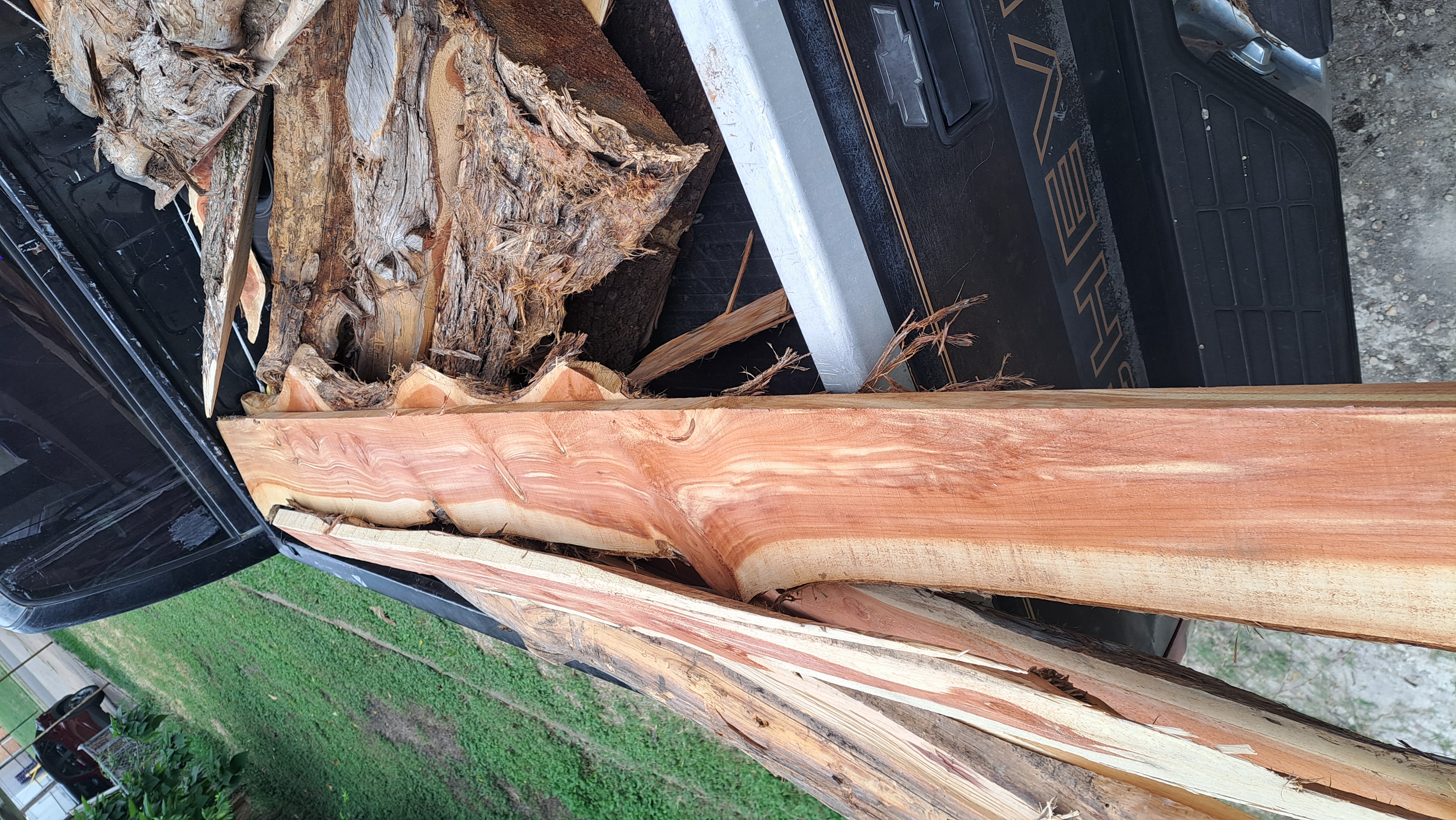 Since that picture I've gotten several more of what he calls "first cut" off the trees. Those are mostly bark on the original outside of the tree with a flat face. Mostly cedar but think there is also some oak or maybe pecan.