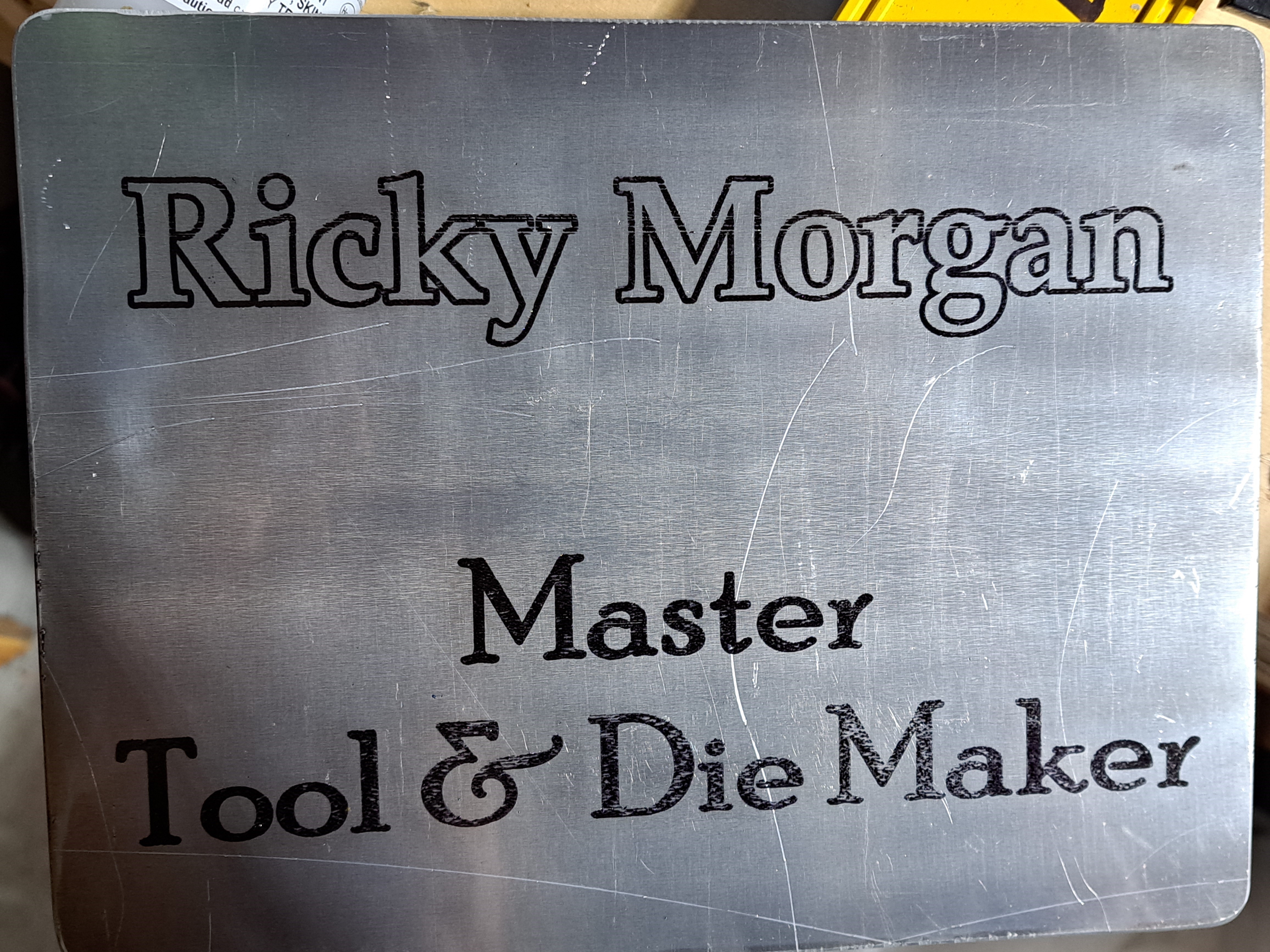 Sign done for the head of the Machine shop where I work. The printing should have been a little darker but I did not adjust for the metal being thinner than the previous pieces I had practiced on. This was done on a 1/8" thick piece of aluminum using a metal marking spray.