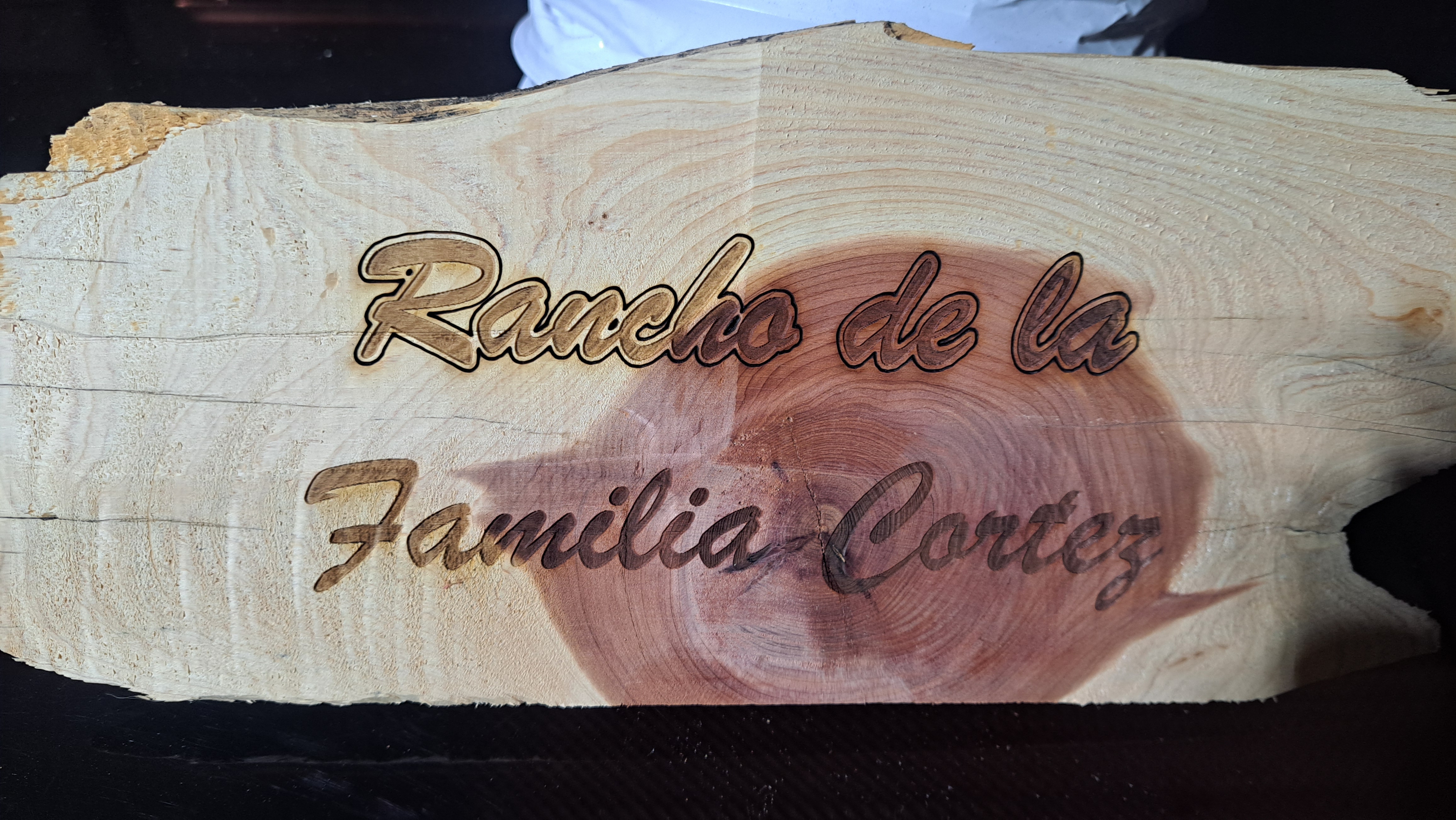Small test sign on a piece of live back-side Red Cedar for a co-worker's family ranch. Will be added to and a lot larger. This was just to get dad interested in it.